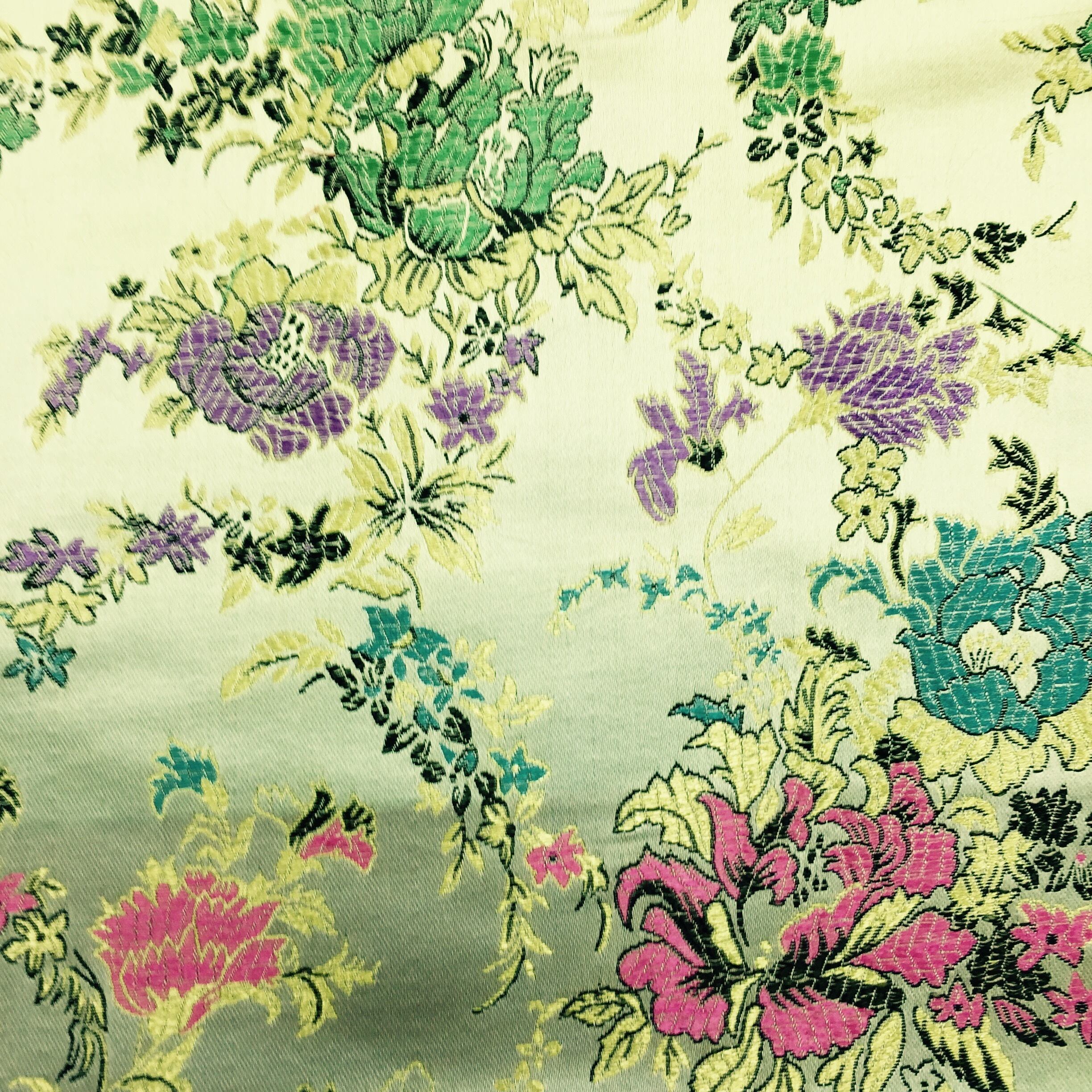 ゴールドベージュの地に牡丹の花が刺繍された生地を使っています