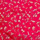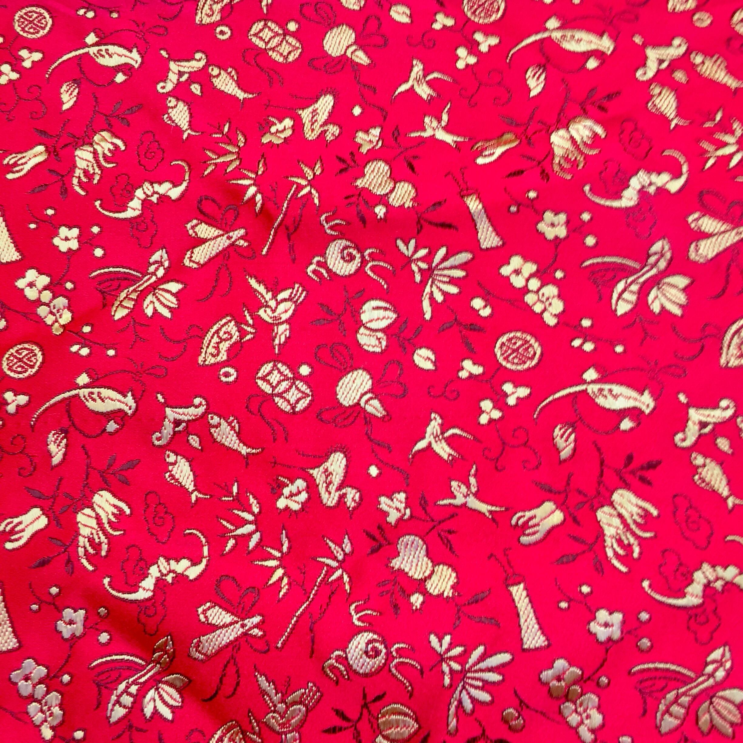 赤地に吉祥柄が刺繍されています